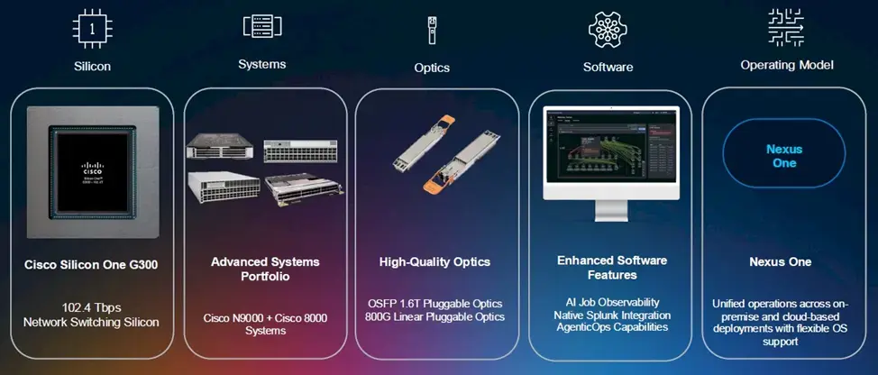 Сегодня выходит G300 вместе с новыми системами Nexus 9000 и Cisco 8000, новыми сменными оптическими модулями, которые в них устанавливаются, а также обновлениями сетевой операционной системы и плоскости управления, чтобы упростить управление более масштабируемыми сетями или более мощными фронтальными сетями, которые обслуживают системы искусственного интеллекта с использованием коммутаторов на базе G300.