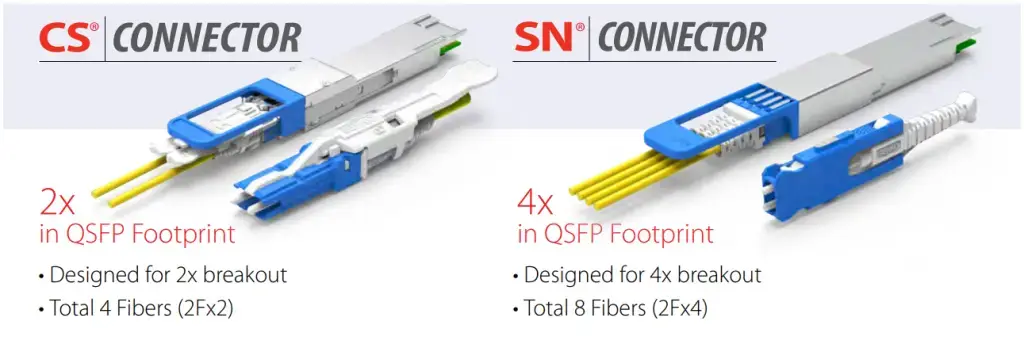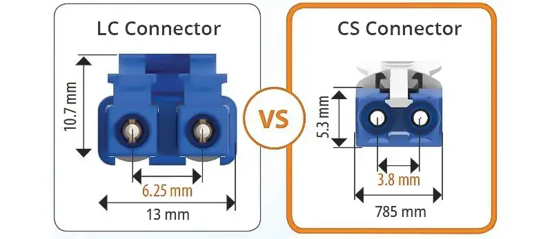 CS (Compact Single) — новый компактный интерфейс (плотнее LC на 50%). Позволяет вставлять больше каналов в один порт трансивера, что актуально для QSFP-DD и будущих 800+ Гбит/c. Используется, когда нужны высокие скорости и минимальная плотность в стойке.