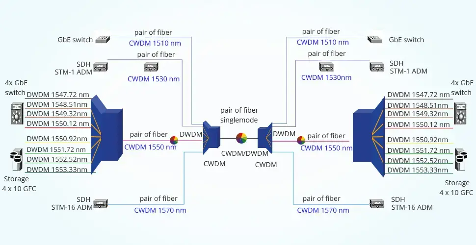 Ещё есть CWDM (Coarse Wavelength Division Multiplexing, грубое разделение по длинам волн) — тоже несколько каналов передаются по одному волокну, но длины их волн далеко друг от друга (обычно с шагом 20 нм, в диапазоне от 1270 до 1610 нм). Из-за этого каналов внутри помещается меньше — максимум до 18 каналов. Зато оборудование дешевле и проще (фильтры и мультиплексоры) — можно работать без охлаждаемых лазеров. Дальность обычно 10–20 км, иногда до 40 км.