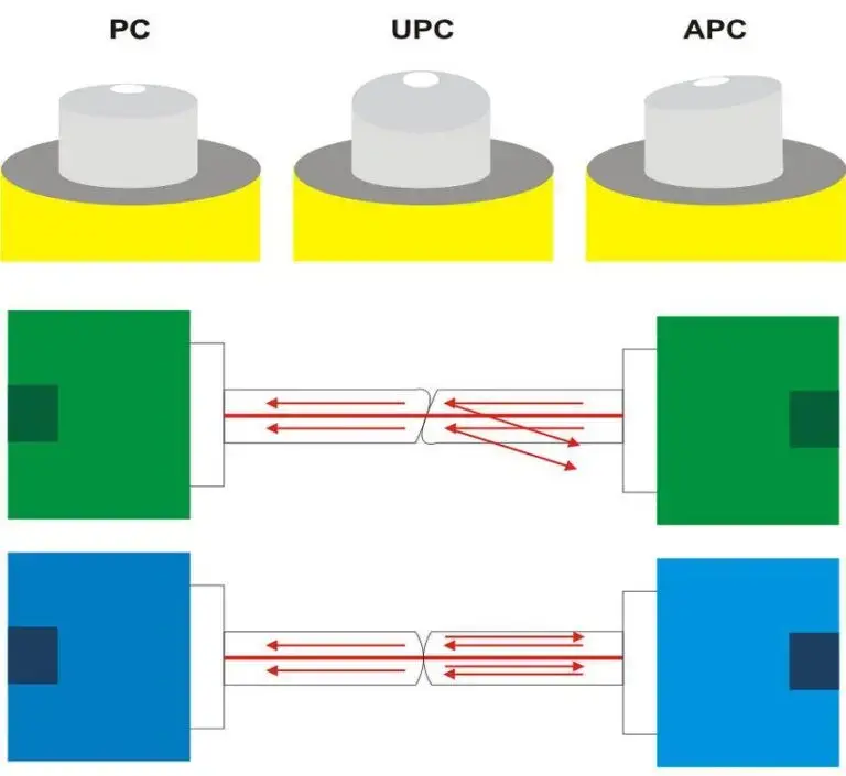 UPC (Ultra Physical Contact) — усовершенствованная версия PC с более точной полировкой. Возвратные потери ниже (до –50 дБ), поэтому UPC подходит для ЦОДов и большинства современных сетей. Обычно разъёмы синего цвета. Используется там, где важно низкое затухание и нет жёстких требований к отражениям (например, внутри ЦОДа, в коротких и средних линках; линки — внутренние каналы связи, бывают логическими, беспроводными и физическими).