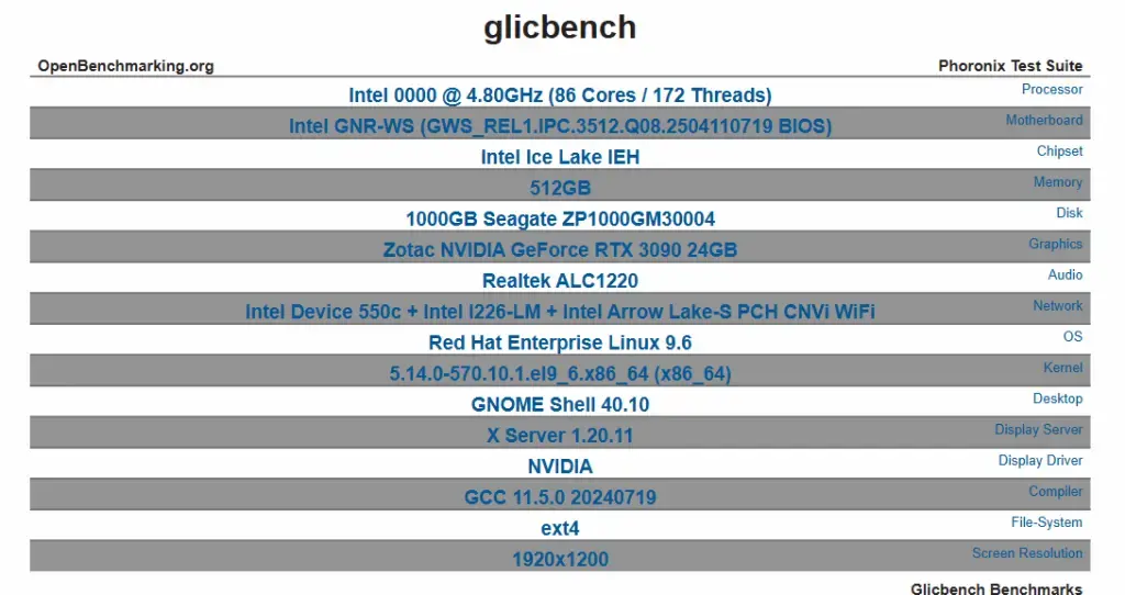 Как видно из данных (таблица представлена ниже), процессор тестировали на эталонной платформе Intel «GNR-WS» (сокр. от Granite Rapids-Workstation). Конфигурация включала 512 ГБ оперативной памяти DDR5, а сетевая подсистема была сопоставима с платформами Arrow Lake-S. В качестве видеокарты использовалась NVIDIA RTX 3090, а объем накопителя составлял 1 ТБ.
