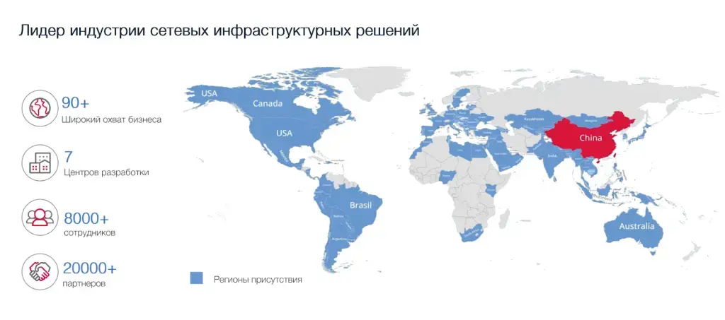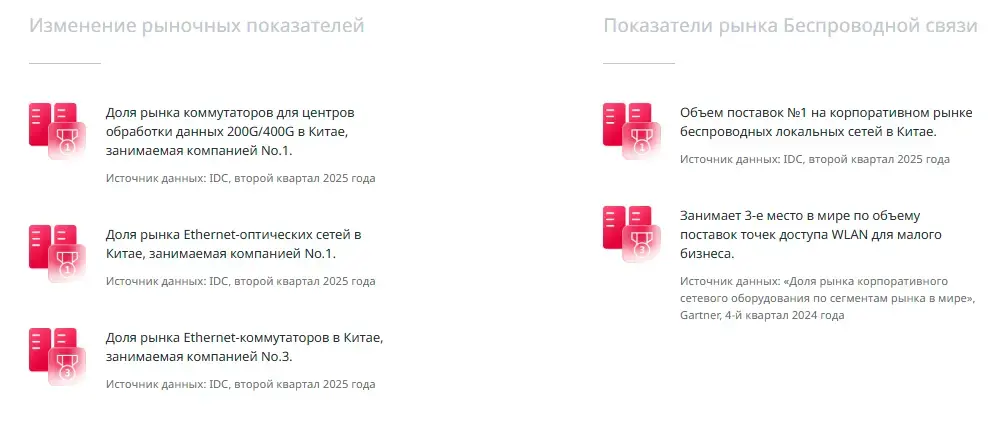 №1 в Китае по Wi-Fi 6E / Wi-Fi 7; доля рынка коммутаторов для ЦОДов 200GE / 400GE в Китае — 30 % (2024); 7 R&D-центров; более 10 млн поставленных устройств |