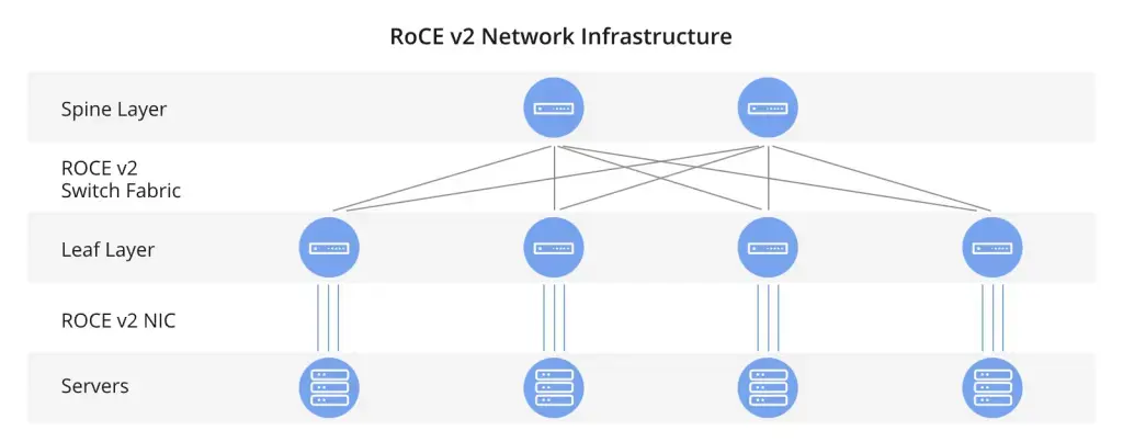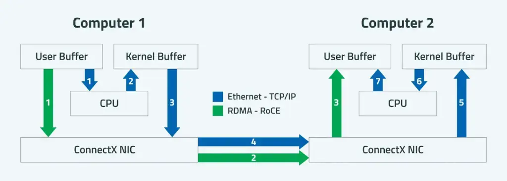 А технология RDMA позволяет передавать данные между устройствами напрямую, минуя обработку центральным процессором. За счёт этого снижается нагрузка на CPU и заметно уменьшаются сетевые задержки. В сочетании с механизмами PFC (Priority Flow Control) и ECN (Explicit Congestion Notification) сеть может контролировать перегрузки и управлять приоритетными потоками трафика. Такой подход помогает избегать потери пакетов и обеспечивает стабильную передачу данных без потерь даже при высокой нагрузке.