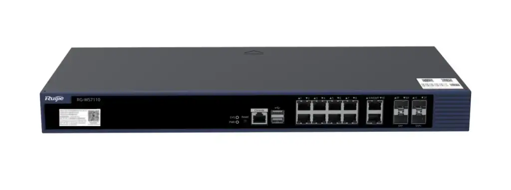 RG-WS7110 — 8 x 1GE SFP/RJ45 combo, 4 x 10GE SFP+, управление до 2034 точек доступа, пропускная способность 802.11 до 40 Гбит/с, VLAN 4K, MAB, 802.1X и веб-аутентификация, балансировка нагрузки.