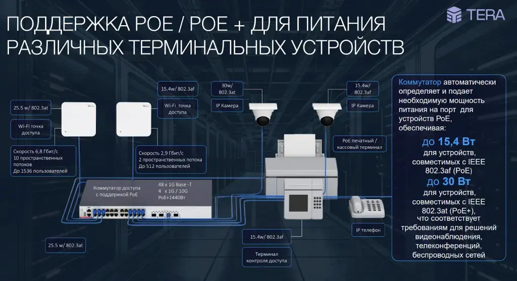 L3-доступ, L2+ доступ (1 / 10 Гбит/с / PoE) |