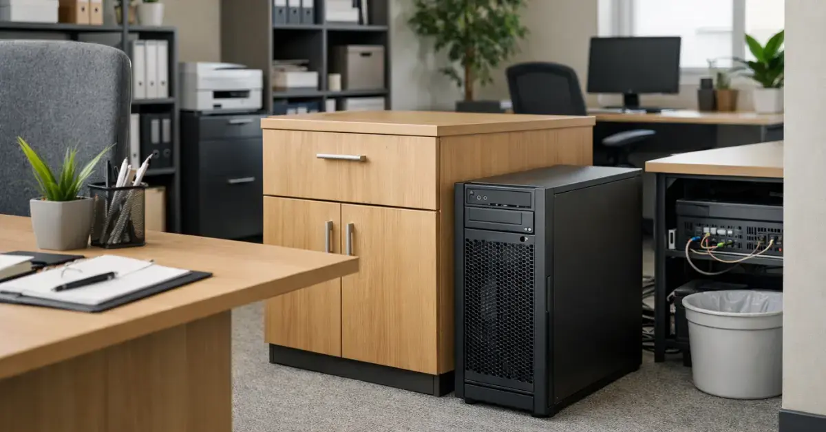 Поставить сервер в офисе можно, но разумно это делать только в одном случае: если заранее понятно, где он будет стоять, как из этого помещения будет уходить тепло, насколько его шум допустим для людей рядом и как сервер будут обслуживать. Для небольшого офиса чаще всего рабочий вариант — один башенный сервер в отдельном кабинете или подсобке с нормальной вентиляцией; ставить горячий и шумный сервер рядом с сотрудниками или прятать его в закрытую мебель почти всегда плохая идея.