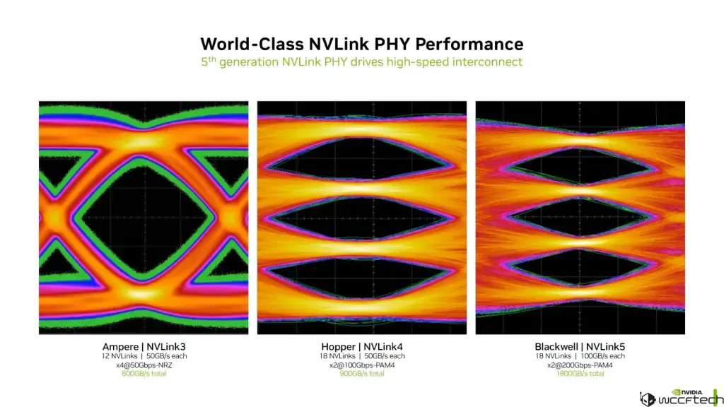 В пятом поколении архитектура NVLink поддерживает до 18 линков на ускоритель с пропускной способностью 100 ГБ/с каждое, что даёт суммарно до 1,8 ТБ/с двунаправленной передачи данных на GPU. Это вдвое больше, чем в предыдущем поколении, и в 7 раз выше, чем у PCIe 6.0 (256 ГБ/с через разъём x16).