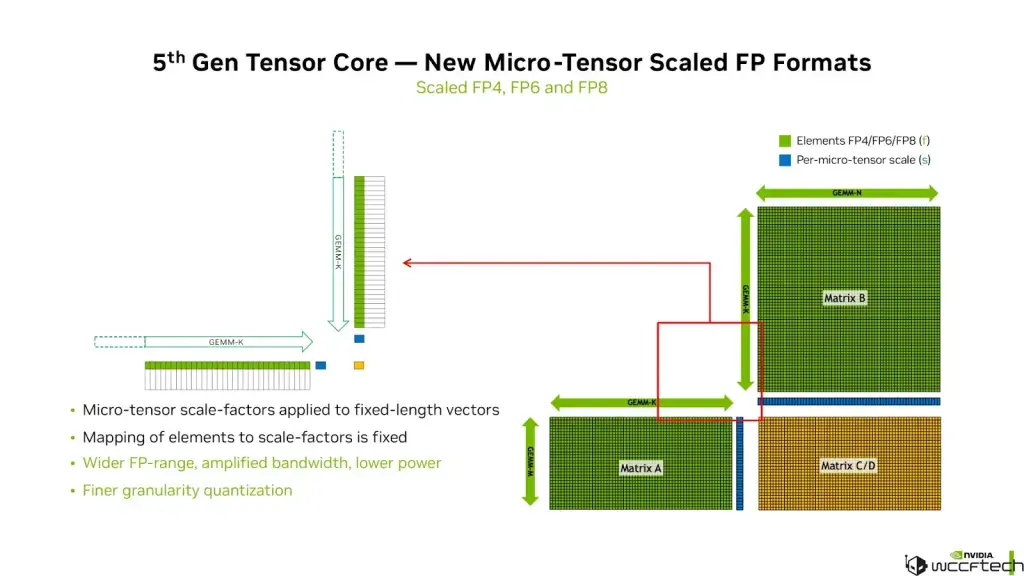 Архитектура Blackwell сделала качественный скачок. Ускоритель NVIDIA B100 анонсировали на GTC 2024 как референс, но первым в массовом внедрении стал GPU GB200. Он получил новое поколение тензорных ядер, появилась поддержка форматов FP6, FP4, пропускную способность памяти увеличили.
