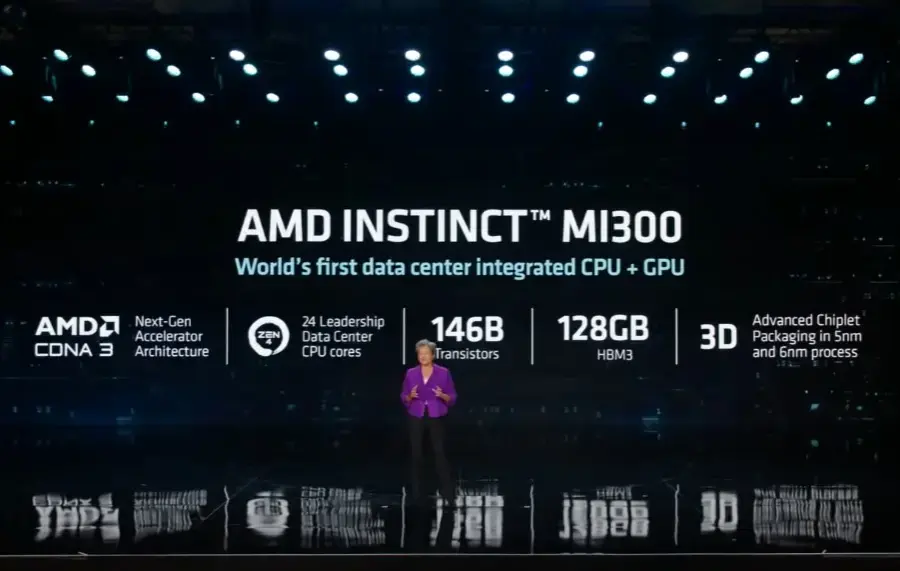 Следующим шагом стало семейство AMD Instinct MI300, где AMD объединила CPU и GPU в одном корпусе — APU для дата-центров. Вариант MI300A совмещает ядра Zen 4 и GPU CDNA 3, обеспечивая когерентность памяти и мгновенный обмен данными между CPU и GPU без внешних шин. Версия MI300X ориентирована исключительно на генеративные вычисления: 192 ГБ HBM3, пропускная способность свыше 5,3 ТБ/с с поддержкой FP8 и BF16 для ускорения ИИ-задач.