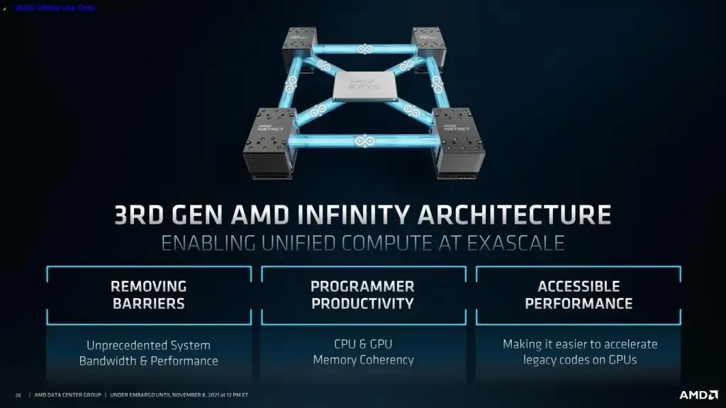 В сериях MI200 и MI250X Infinity Fabric (через интерфейс XGMI) обеспечивала связь между двумя GPU-кристаллами в одном модуле с двунаправленной пропускной способностью около 400 ГБ/с. В MI300 эта технология перешла на версию Infinity Fabric 3.0, которая соединяет CPU, GPU и подсистему ввода-вывода (I/O) внутри одного модуля, предлагая когерентный доступ к общей памяти и совокупную внутреннюю пропускную способность до нескольких терабайт в секунду (в зависимости от конфигурации).