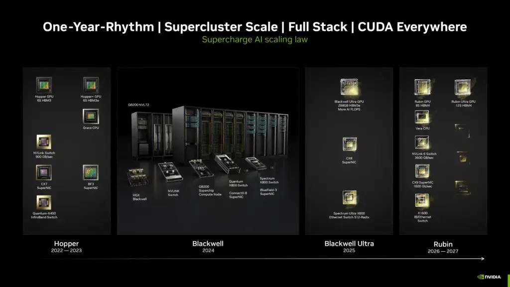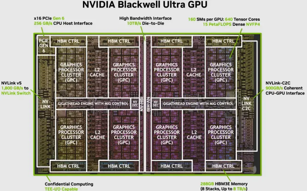 В последней на 2025 год серии Blackwell каждый GPU Blackwell Ultra (B300) имеет 288 ГБ HBM3e памяти, GPU-кристаллы соединены через NV-HBI-интерфейс, а между GPU используется NVLink 5 с двунаправленной пропускной способностью 1,8 ТБ/с на один ускоритель в домене NVSwitch, что даёт 15 PFLOPS в FP4 при энергопотреблении 1400 Вт на GPU.