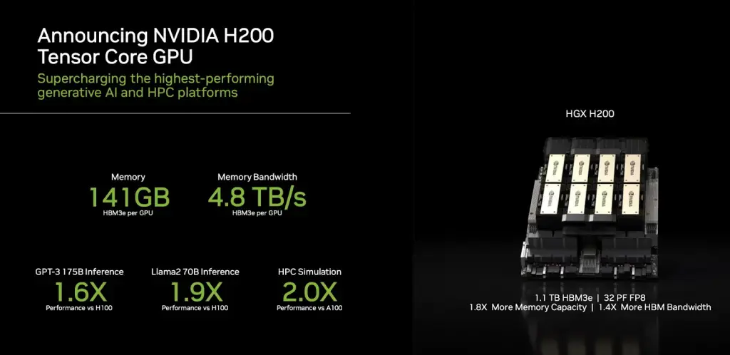 Ускоритель NVIDIA H200 добавил к этому поддержку NVLink 4 (про это дальше) и сохранил тот же TDP, но получил более быструю память HBM3e (~4.8 ТБ/с), что повысило эффективность при работе с очень большими моделями.