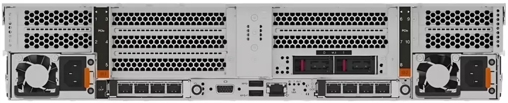 Отсеки для накопителей На передней панели: до 24 2,5-дюймовых SAS/SATA/NVMe, 32 E3.S NVMe или 12 3,5-дюймовых модулей SAS/SATA На средней панели: до 8 2,5-дюймовых модулей SAS/SATA/NVMe На задней панели: до 8 2,5-дюймовых или 4 3,5-дюймовых модулей SAS/ SATA/NVMe Самозагружаемое устройство: до 2 накопителей M.2 SATA/NVMe с поддержкой RAID, опциональная функция горячей замены Поддержка Direct NVMe, VROC/VMD