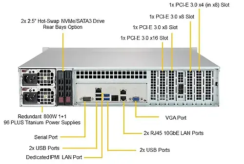 On-Board Devices SATA SATA3 (6 Гбит / с) через контроллер C622 Поддержка RAID 0, 1, 5, 10 SAS3 (12 Гбит / с) через Broadcom 3008 ПО RAID 0, 1, 10 Двойная локальная сеть с 10GBase-T с Intel® X722 + X557 Поддержка интеллектуального интерфейса управления платформой v.2.0 IPMI 2.0 с виртуальным носителем через LAN и поддержкой KVM-over-LAN ASPEED AST2500 BMC