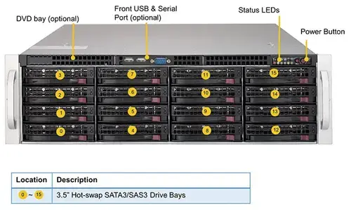 Отсеки для дисков 16 отсеков для 3,5-дюймовых дисков SAS3 / SATA3 с возможностью горячей замены 2 Дополнительный встроенный NVMe M.2