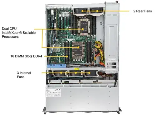On-Board Devices SAS3 (12 Гбит / с) через Broadcom 3108 AOC HW RAID RAID 0, 1, 5, 6, 10, 50, 60 SATA3 (6 Гбит / с) с RAID 0, 1, 5, 10 2 порта LAN 10GBase-T с Intel X722 + PHY Intel X557 Поддержка интеллектуального интерфейса управления платформой v.2.0 IPMI 2.0 с виртуальным носителем через LAN и поддержкой KVM-over-LAN ASPEED AST2500 BMC