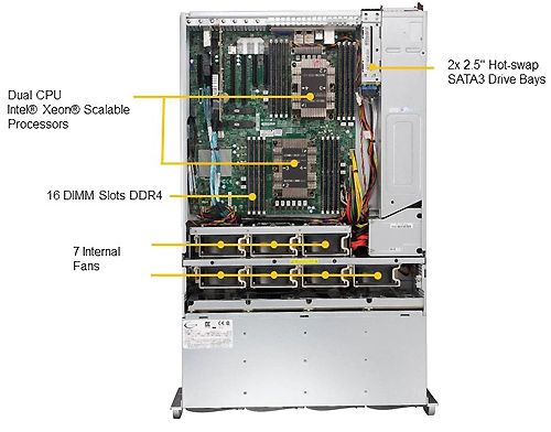 On-Board Devices SAS3 (12 Гбит / с) через Broadcom 3108 AOC HW RAID RAID 0, 1, 5, 6, 10, 50, 60 SATA3 (6 Гбит / с) с RAID 0, 1, 5, 10 Два порта LAN 10GBase-T с Intel X722 + PHY Intel X557 Поддержка интеллектуального интерфейса управления платформой v.2.0 IPMI 2.0 с виртуальным носителем через LAN и поддержкой KVM-over-LAN ASPEED AST2500 BMC