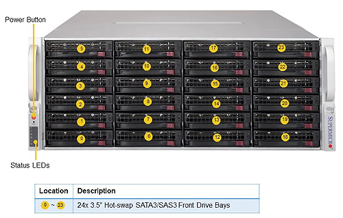 Отсеки для дисков 36 отсеков для 3,5-дюймовых дисков SAS3 / SATA3 с возможностью горячей замены 2 отсека для 2,5-дюймовых дисков SATA3 с возможностью горячей замены (сзади)