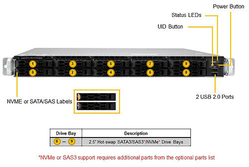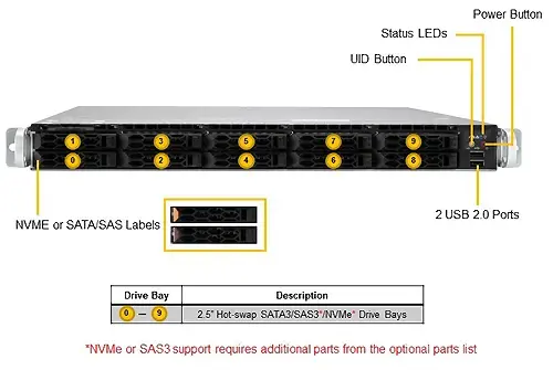 Вентиляторы 10 отсеков для 2,5-дюймовых дисков NVMe / SATA / SAS с горячей заменой (10 гибридных 2,5-дюймовых NVMe) Поддержка привода U.2 2 M.2 NVMe, M-key, 2280