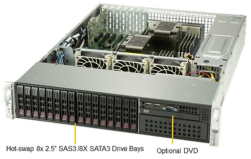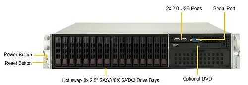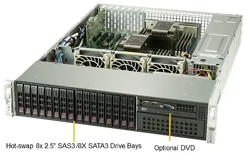 Отсеки для дисков 8 отсеков для дисков 2,5 дюйма SAS3 и 8 отсеков для дисков 2,5 дюйма SATA3 с возможностью горячей замены Дополнительный привод DVD-ROM поддерживает 1x тонкий или 1x 5,25-дюймовый DVD-привод Дополнительные 2 фиксированных диска NVMe / SSD / HDD 2,5 дюйма 1 поддержка M.2