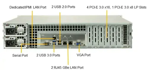Порты ввода-вывода 8 портов SATA3 (6 Гбит / с) 8 портов SAS3 (12 Гбит / с) 2 порта RJ45 Gigabit Ethernet LAN 1 выделенный порт LAN IPMI с разъемом RJ45 2 порта USB 3.0 (2 сзади) 4 порта USB 2.0 (2 сзади, 2 спереди) 1 разъем USB типа A 1 разъем VGA 2 Fast UART 16550 последовательный 2 COM-порта (1 сзади, 1 спереди)