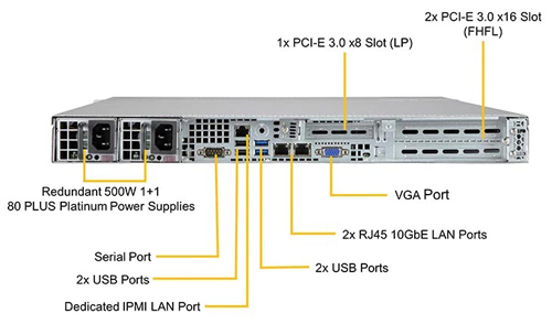 Форм-фактор 10 портов SATA3 (6 Гбит / с) 2 порта RJ45 10GBase-T LAN 1 выделенный порт LAN IPMI с разъемом RJ45 5 портов USB 3.0 (2 задних + 2 разъема + 1 Type A) 7 портов USB 2.0 (2 задних + 5 разъемов) 1 порт VGA 2 COM-порта (1 задний, 1 передний) 2 порта SuperDOM (Disk on Module) со встроенным питанием