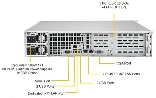 Порты ввода-вывода RAID 0, 1, 5, 10 Двойная локальная сеть 10GBase-T с Intel® X722 + X557 Поддержка интеллектуального интерфейса управления платформой v.2.0 IPMI 2.0 с виртуальным носителем через LAN и поддержкой KVM-over-LAN