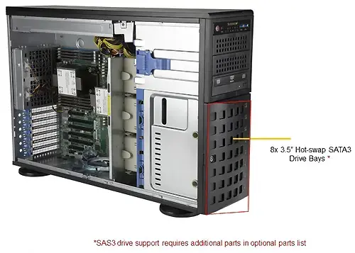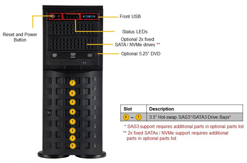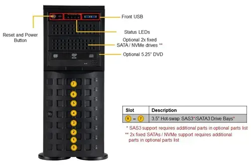 Отсеки для дисков 8 отсеков для 3,5-дюймовых оперативно заменяемых дисков SATA3 (8 отсеков для 3,5-дюймовых оперативно заменяемых дисков SATA можно преобразовать в 8 отсеков для дисков SAS путем добавления 1x AOC-S3108L-H8IR или AOC-S3108L-H8IR-16DD + 2x CBL-SAST-0531 -01) 1 слот M.2 NVMe 1x 5,25-дюймовый отсек для дисководов DVD (дополнительно)