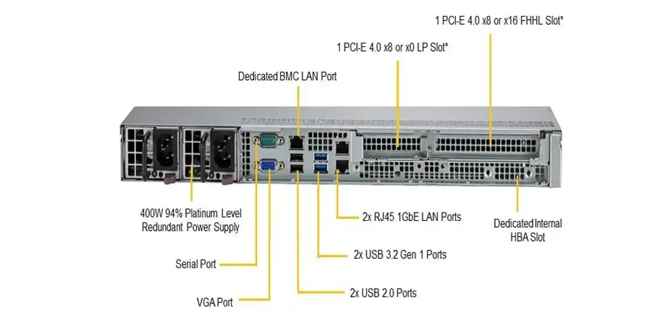 Порты ввода вывода 8 портов SATA (6 Гбит/с) 1 выделенный порт IPMI LAN RJ45 2 LAN-порта RJ45 1GbE 5 портов USB 3.2 Gen 1 (2 разъема, 2 сзади, 1 тип A) 6 портов USB 2.0 (4 разъема 2 сзади) 1 порт(ы) VGA 2 COM-порта (1 главный, 1 задний) 2 порта Super DOM (диск на модуле) со встроенным питанием