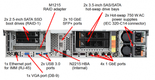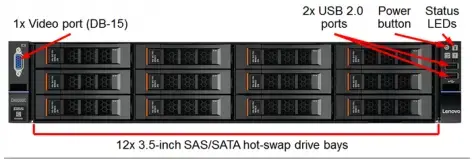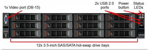 Отсеки для дисков (на узел) (12) 3,5-дюймовых и два задних 3,5-дюймовых жестких диска + два 2,5-дюймовых жестких диска/твердотельных накопителя (SSD)
